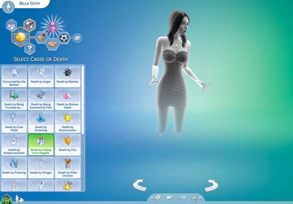 选择死亡原因是最新补丁中添加的《模拟人生 4 幽灵》新功能。让您立即选择死因,而不必在实时模式中经历悲剧。可以通过选择左上角的六边形问题图标来激活该菜单。触发您当前安装的包和 DLC 中所有《The Sims 4 Deaths》的菜单。