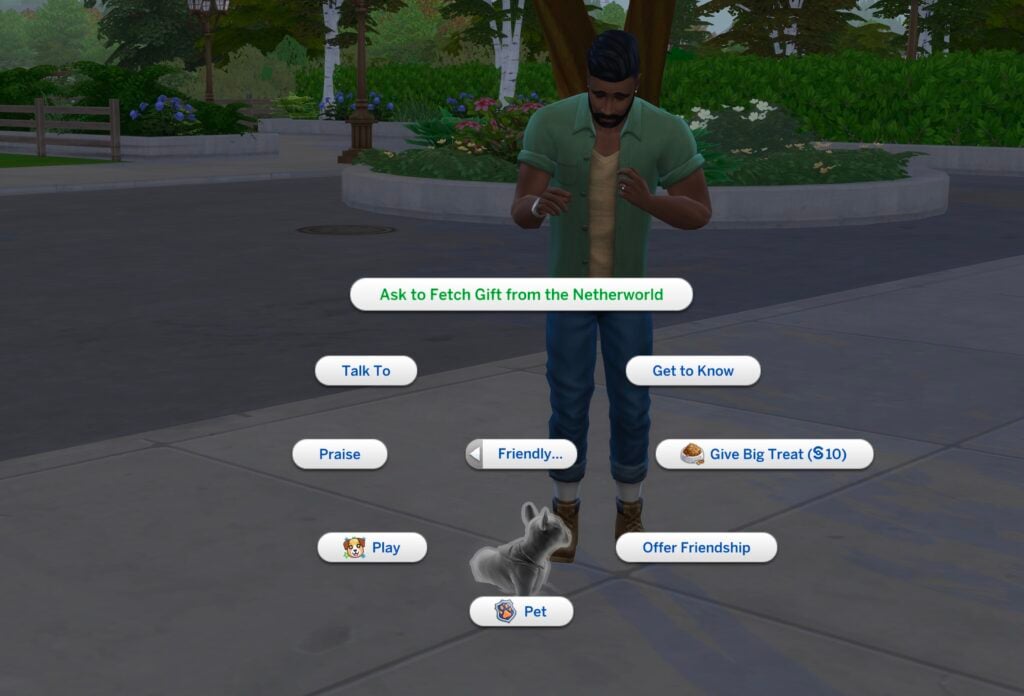 如果您安装了《The Sims 4 Cats & Dogs Expansion》,您将能够在 Sims 和 Cats and Dogs 之间使用全新的交互方式。 “请求从虚空取礼物”互动将把你的宠物送到世界各地,带回礼物。