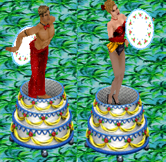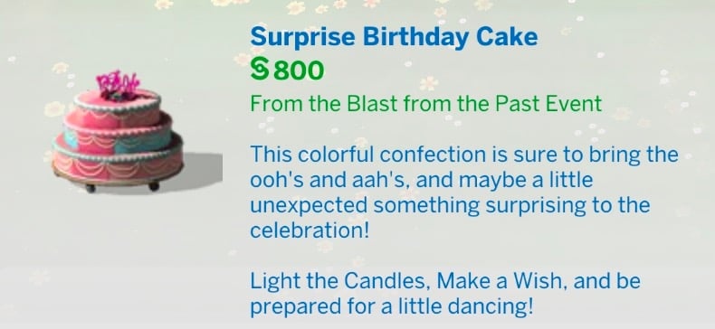 这个标志性物品首次在《模拟人生 1:家庭派对》扩展包中引入。 NPC 蛋糕舞者 Sim 会隐藏在蛋糕下面,直到收到执行舞蹈动作的交互命令: