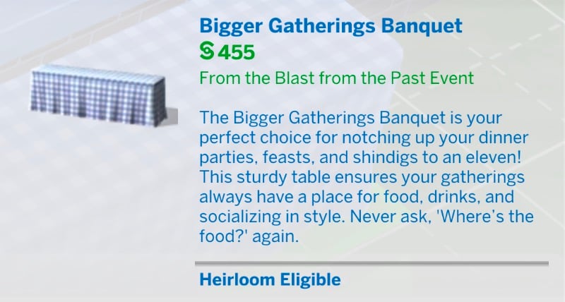 有一张新的《模拟人生 4》基础游戏宴会桌,您可以在即将举行的《模拟人生 4》现场活动中解锁它!该对象可以让您提供预制的各种菜肴,或者您可以选择将其与您选择的任何食谱一起储存: