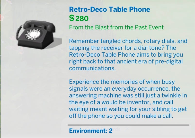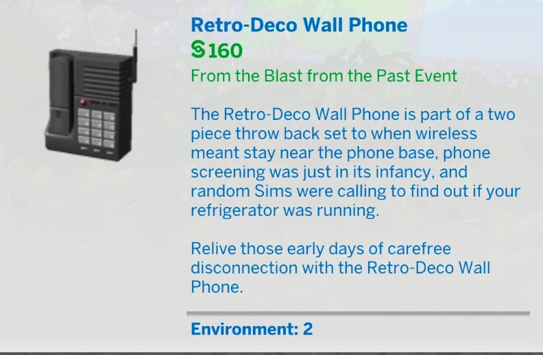 是时候停止猜测了——复古桌式电话和壁式电话纯粹是装饰性的!考虑到《模拟人生 4》中的所有电话交互都是通过用户界面完成的,因此尚未实现选择电话社交的交互方式。至少官方是这样。