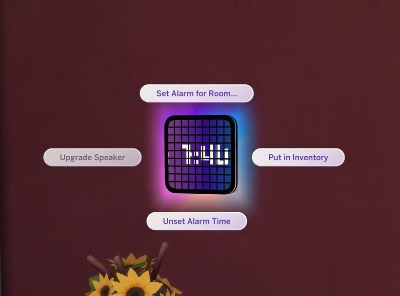 该套装中有两款 Luminova 智能时钟,而且都很实用!一是床头智能钟;它看起来像一个带有动画屏幕的迷你智能中心。您还可以为一天中的任何时间设置闹钟! (此功能需要最新的 Sims 4 补丁更新,因为我使用的是 25 周年纪念活动即将推出的闹钟中的代码。)