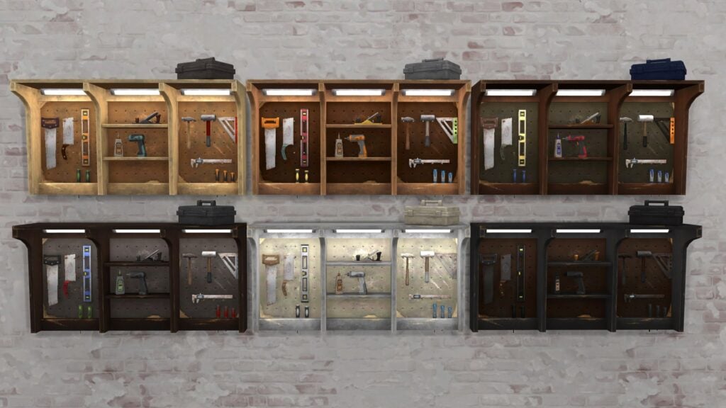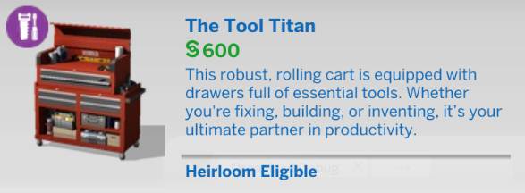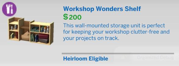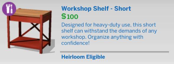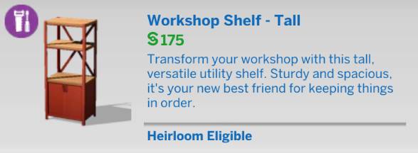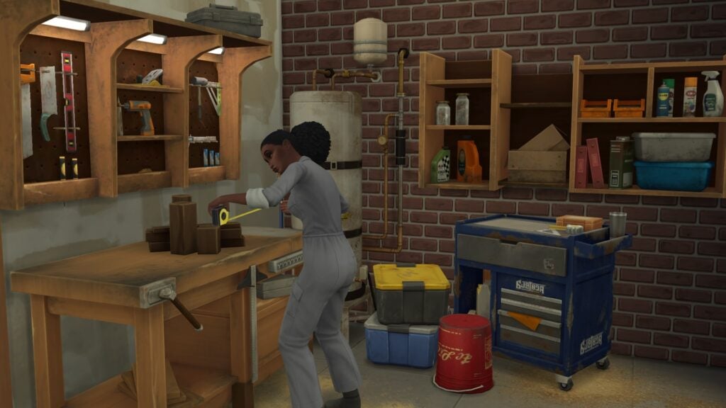 - 功能空间– 创建一个研讨会,激励模拟人生提高他们的技能!这个空间有模块化的架子,所以你会有充足的存储空间,还有热水器、保险丝盒、落地扇和木工长凳等互动物品。