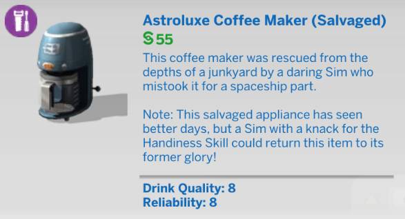- 干得好– 该套件包括 4 台古董电器——微波炉、咖啡机、冰箱和炉灶——需要一点细心呵护。拥有灵巧技能的西姆斯可以开始工作,让它们恢复昔日的辉煌,让它们再次发挥作用。