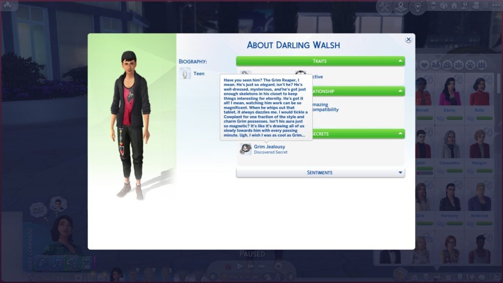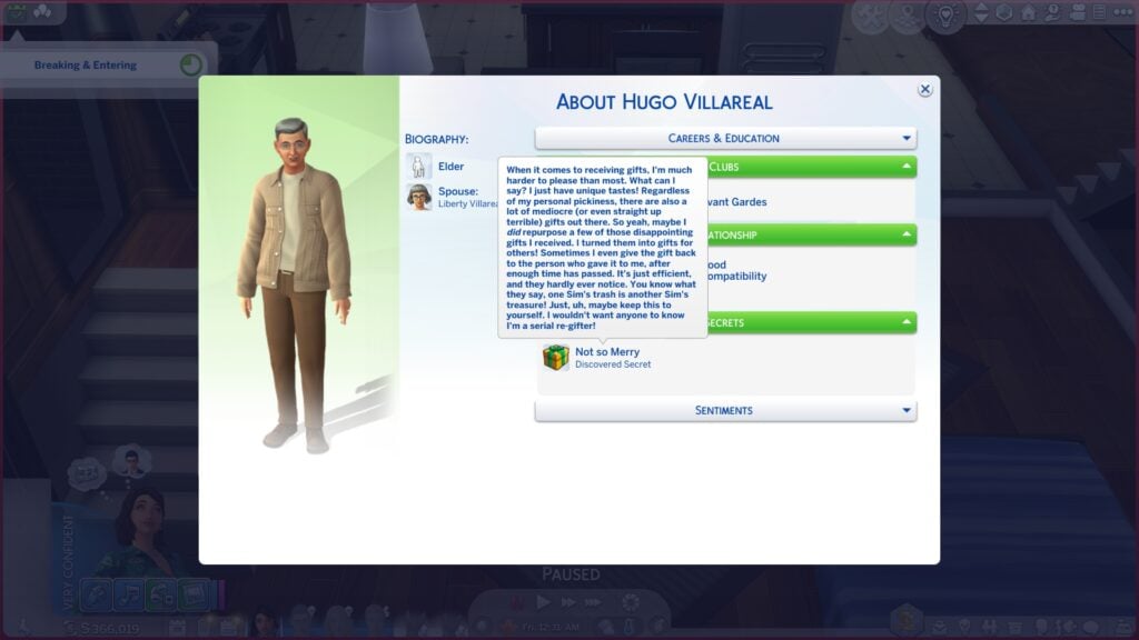 就像真人一样,所有模拟人生都有秘密。现在,可以在模拟人生的个人资料中发现和查看《模拟人生 4》的秘密,但前提是您的模拟人生首先发现它们。秘密就像信息工具提示,一旦发现,就可以在模拟人生的个人资料中查看。每个模拟市民的个人资料上都有一个新的秘密部分。如果您的模拟市民发现了有关模拟市民的秘密,该秘密将显示在其个人资料的这一部分中。将鼠标悬停在秘密上将显示该秘密的详细描述。