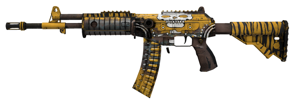 加利尔 AR 是一款经济实惠的步枪,经常被玩家在游戏早期阶段使用。该武器的话匣子皮肤以其色彩缤纷的设计赋予其俏皮和卡通的外观。它的侧面还有一个对话气泡,增加了它的整体魅力。