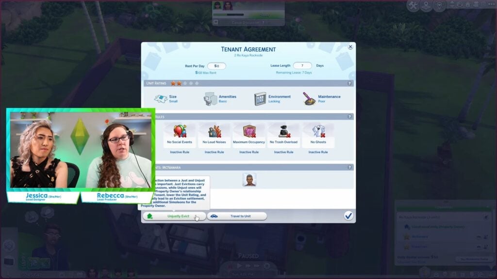 当然,并不是每个租户都会遵守规则。您可能会发现一些租户公然无视您制定的规则,或者他们一直迟付租金。如果发生这种情况,您可以驱逐他们并找到更好的租户。不过,你也可以给陷入困境的模拟人生一个喘息的机会,并为他们提供第二次机会。他们会感激你的善意并扭转局面!虽然您可以无缘无故地驱逐模拟市民,但没有正当理由这样做是不公正的驱逐,并且您的模拟市民会因不公正地驱逐租户而产生负面后果。