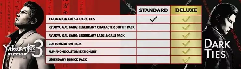 《如龙极速 3》是 2009 年游戏的全面重制版,通过增强的战斗、新的过场动画和扩展的支线活动重新构想了桐生一马的冲绳和东京故事线。与此同时,《Dark Ties》是套装中包含的一款全新独立游戏,由原版《如龙 3》的反派 Mine Yoshitaka 主演。这款衍生作品的重点是 Mine 陷入黑社会,将戏剧性的故事讲述与基于拳击的战斗和各种侧面体验融为一体。